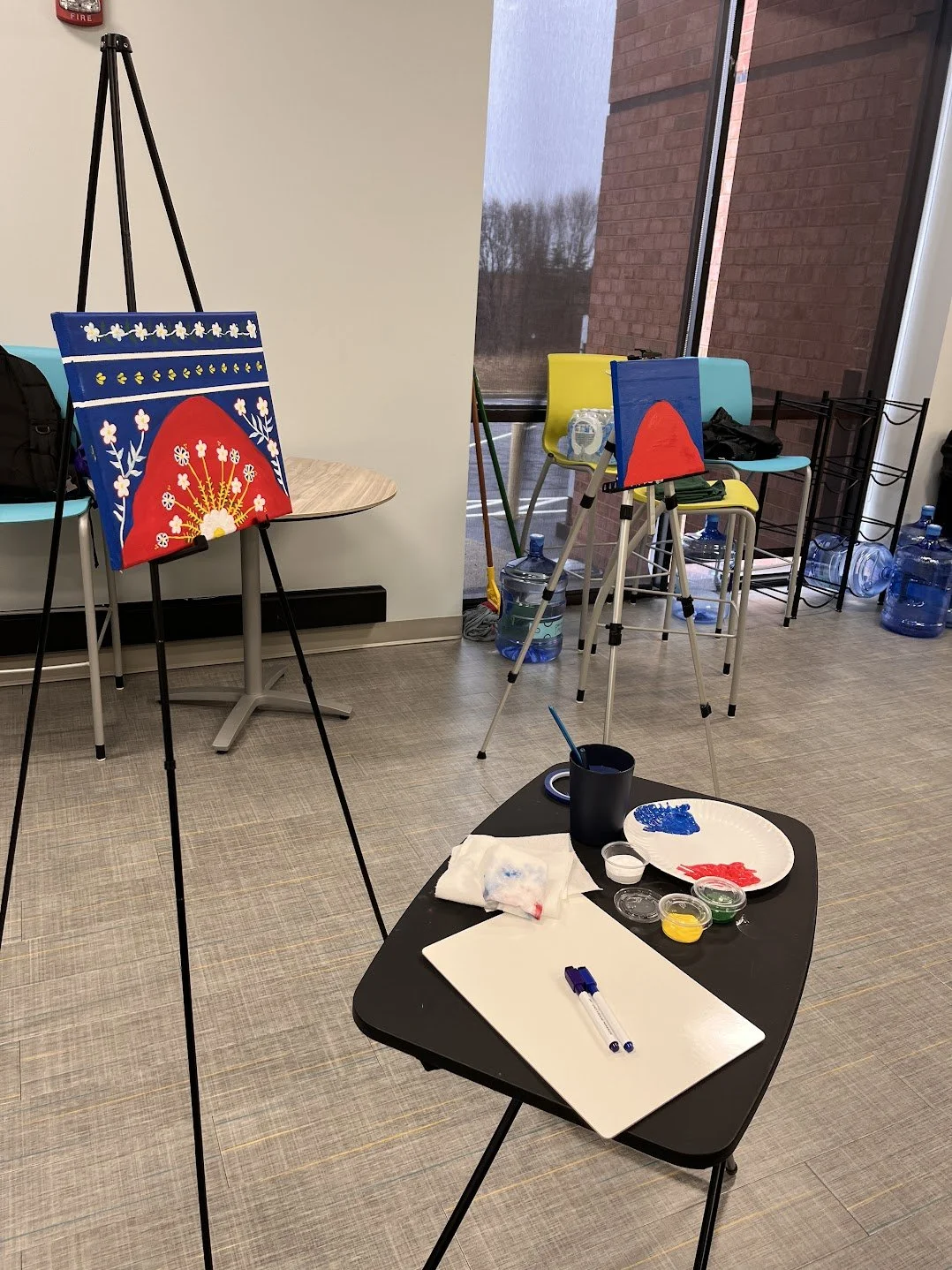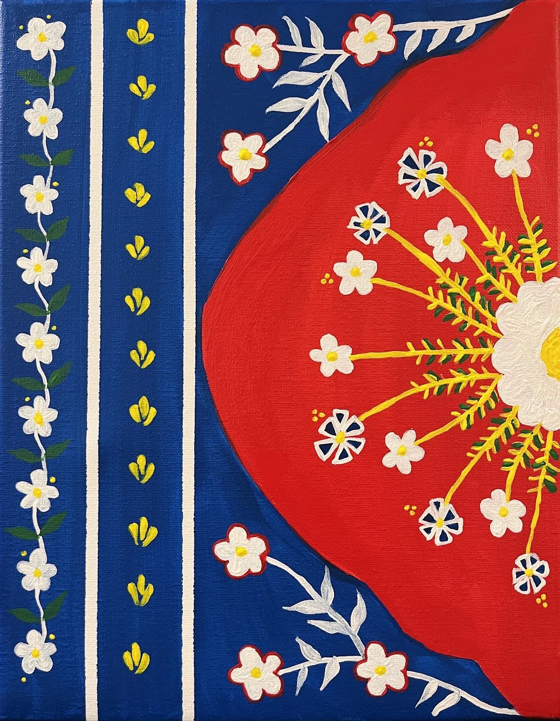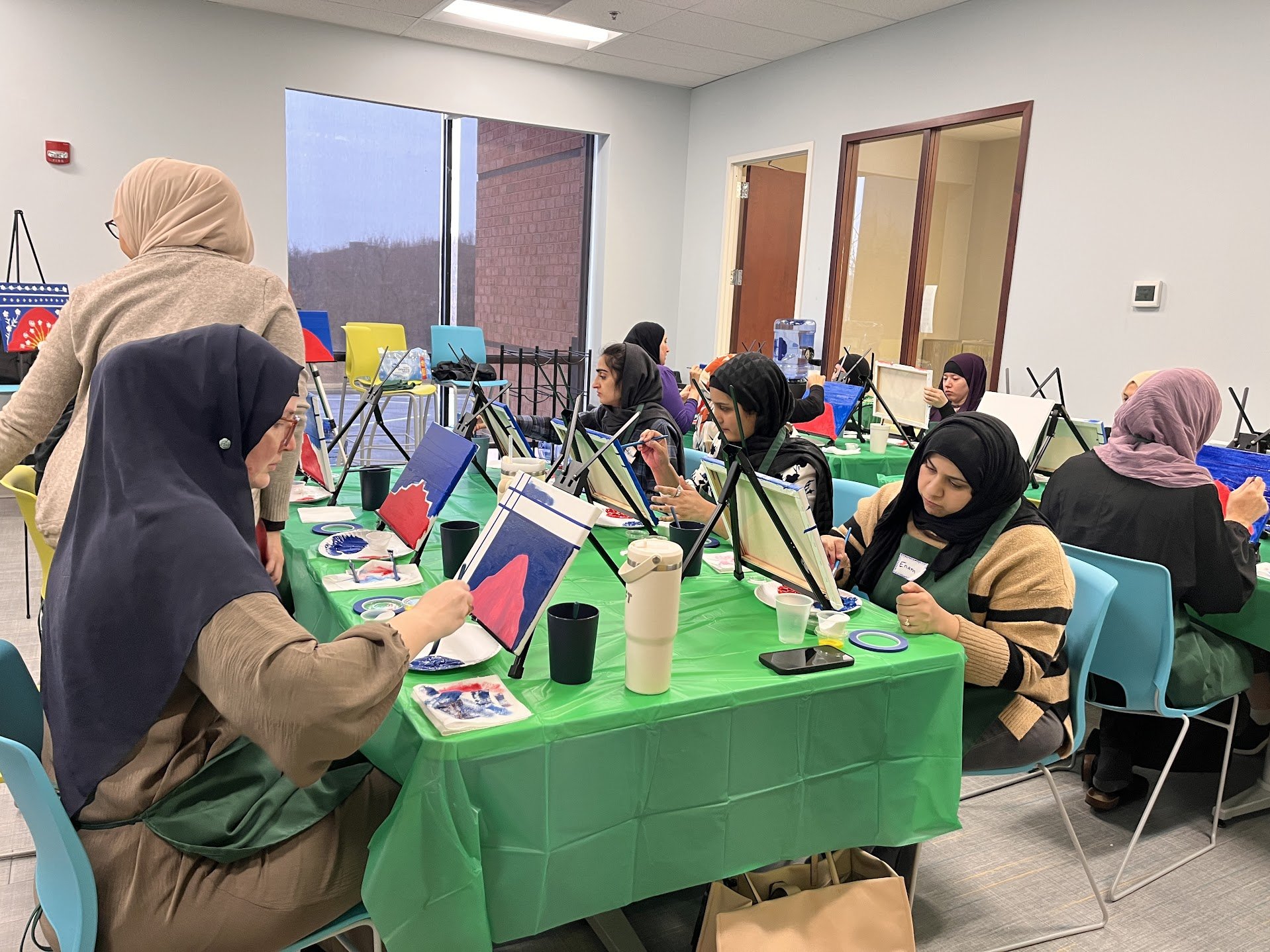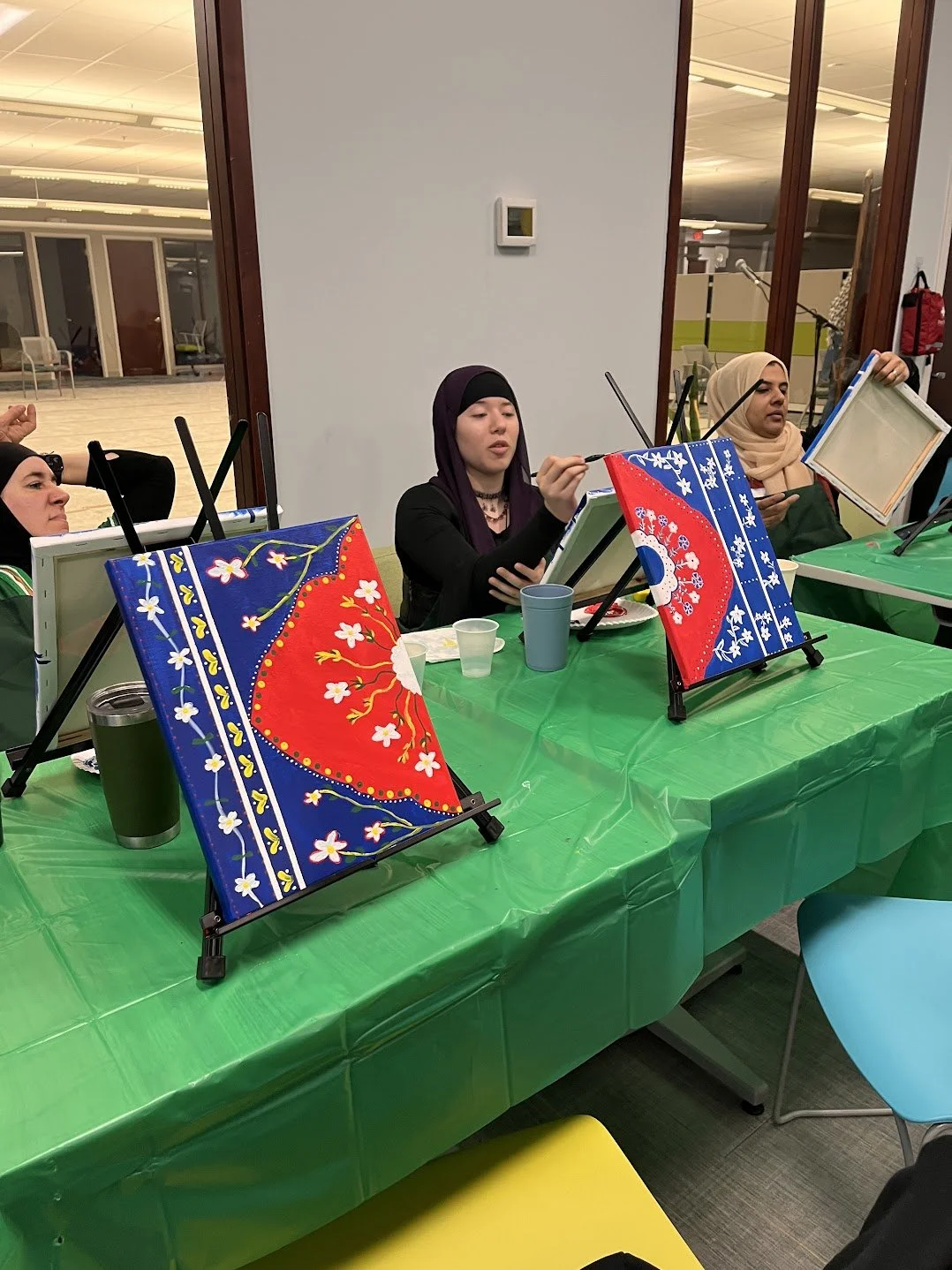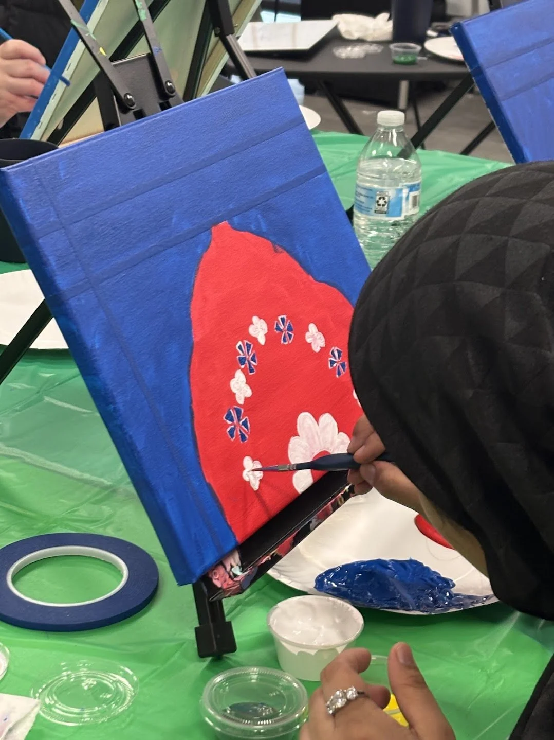 Arabesque is the mesmerizing pattern of intertwining vines, flowers, and geometric shapes that has adorned mosques, palaces, and manuscripts for centuries. In this Arabesque Workshop, participants used painter's tape to divide their canvases into two distinct sections before mixing rich, vibrant reds and deep blues to paint a bold, striking background.