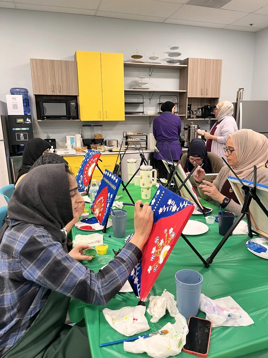 Given the intricate nature of arabesque, this was a two-hour class and we made the most of the paint drying time with a well-deserved food break! Once the background was set, participants picked up their brushes and used white, yellow, and green to bring classic arabesque elements to life - flowing vines, delicate flowers, and layered leaves.