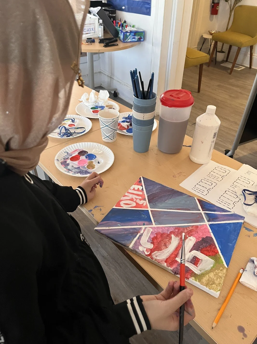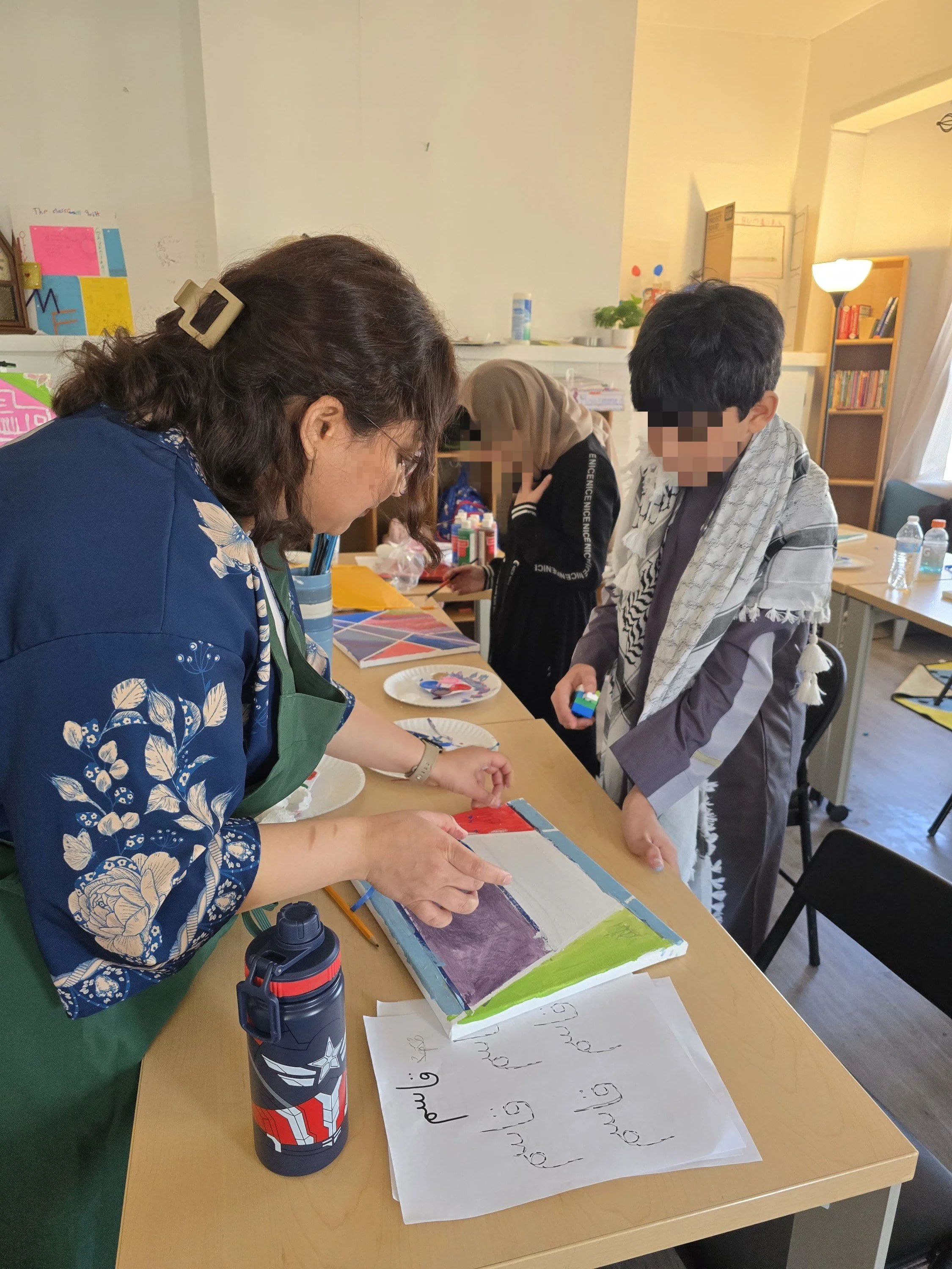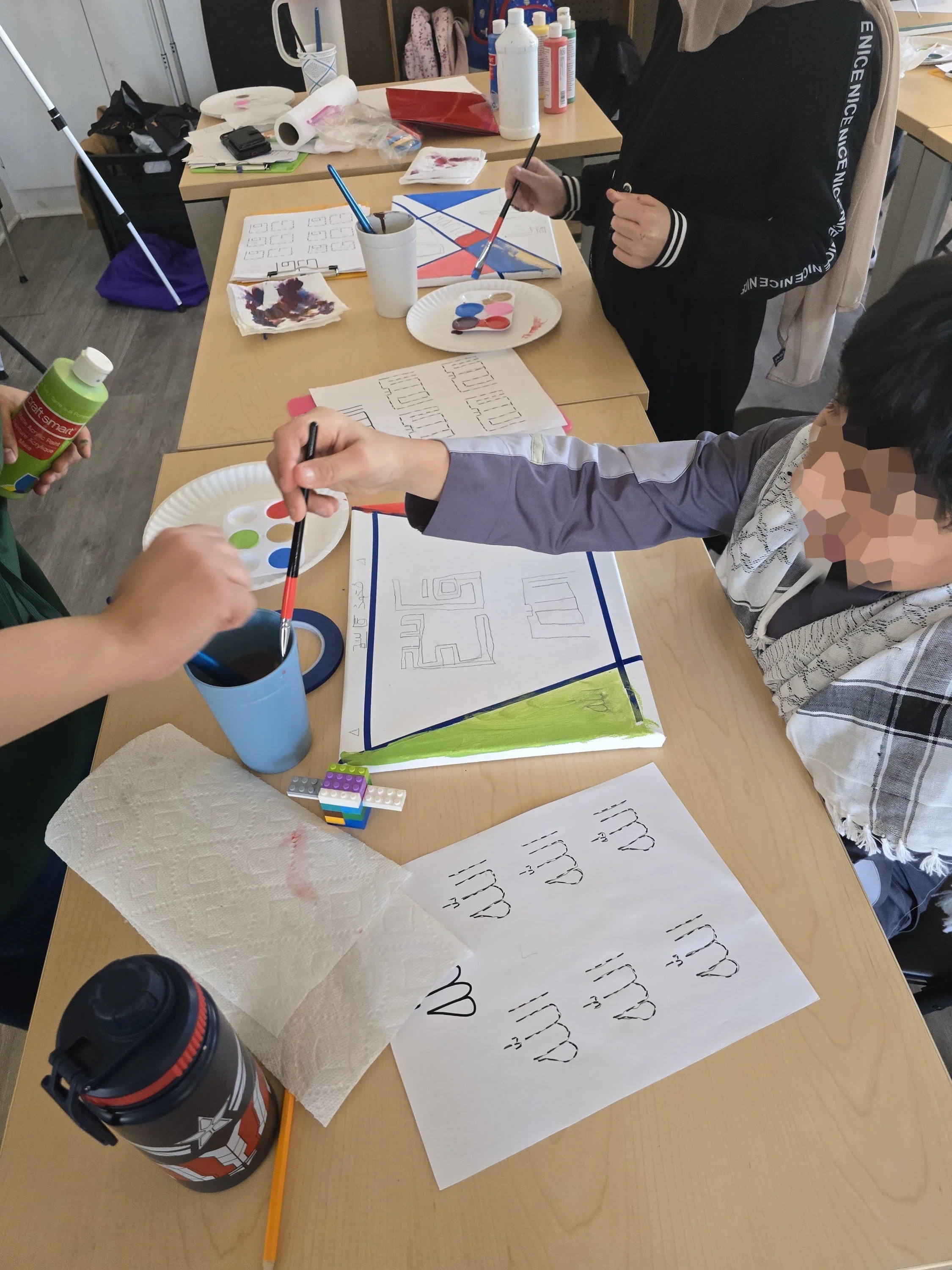 Each child received a custom calligraphy practice sheet featuring their own name alongside meaningful words like Allah, Mohammed, and more, giving them plenty of inspiration to work with. Once they felt confident with their letters, the real fun began: painting their favorite words onto canvas using a completely free range of color. We encouraged every child to mix and experiment, discovering their own unique hues along the way. The results were as bold and individual as the kids themselves.