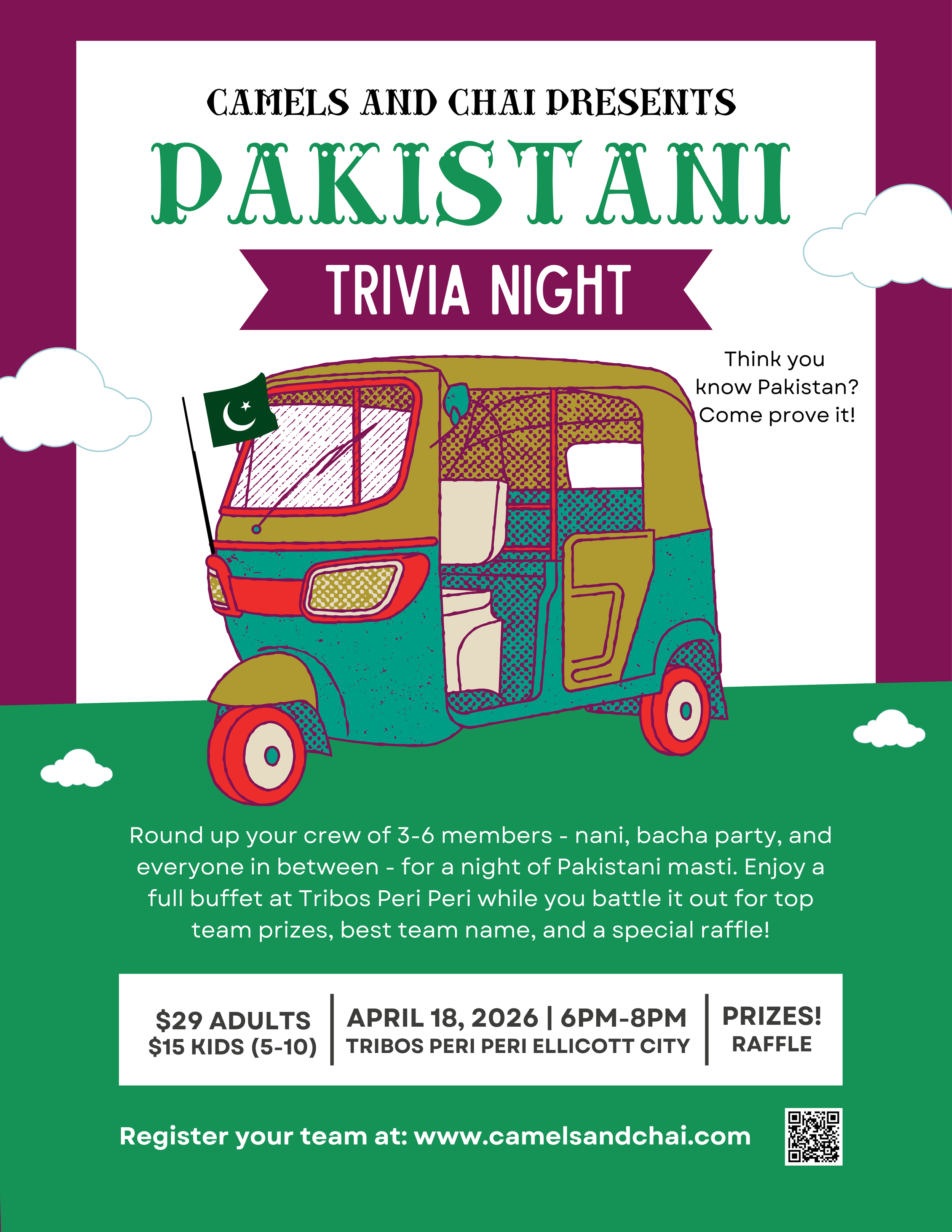 Get ready for a high-energy evening of spicy competition, cultural pride, and plenty of chai! This is a family-friendly trivia night for everyone: from Nani to the bacha party. We'll test your knowledge on Pakistani history, geography, music, TV shows, cricket, and pop culture.