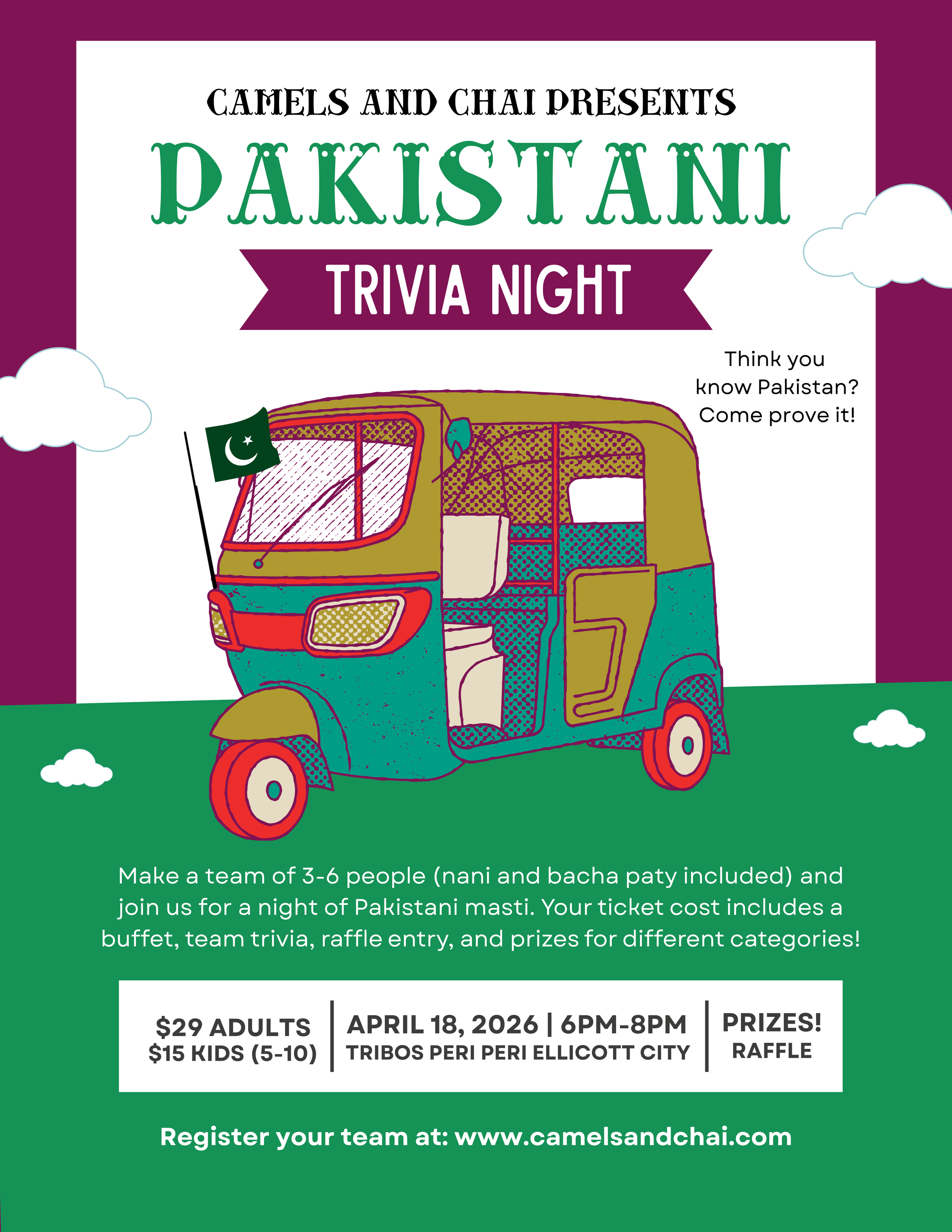 Get ready for a high-energy evening of spicy competition, cultural pride, and plenty of chai! This is a family-friendly trivia night for everyone: from Nani to the bacha party. We'll test your knowledge on Pakistani history, geography, music, TV shows, cricket, and pop culture.